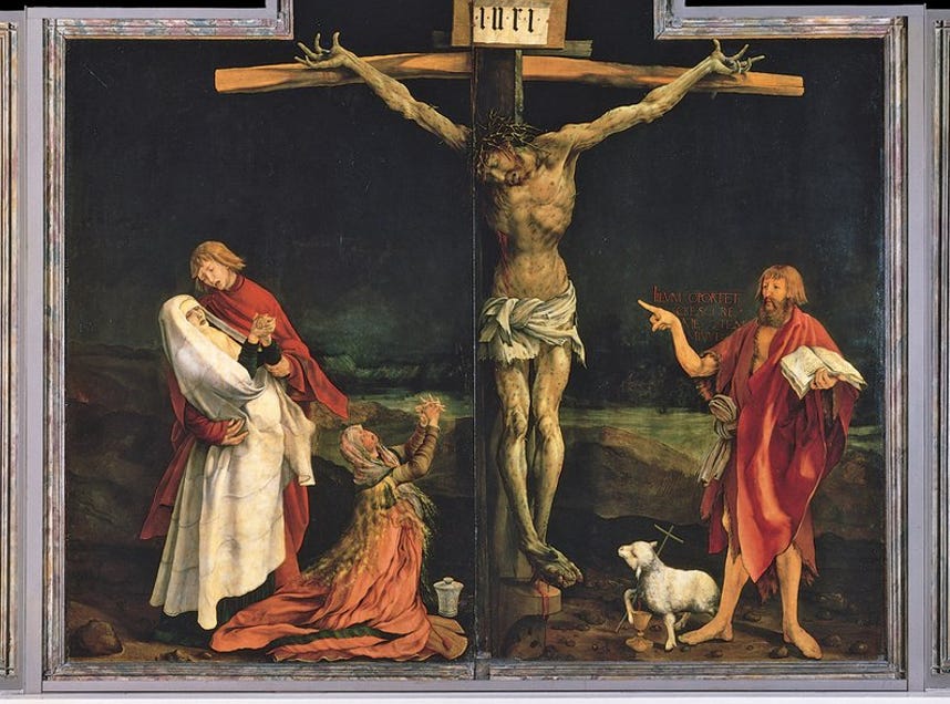 Grünewald: Mary, mother of Jesus, is at his right hand, supported by John the beloved disciple, in the company of Mary of Bethany. John the Baptizer is at Jesus‘ left, pointing to Jesus with the “prodigious index finger” of the entire prophetic tradition.