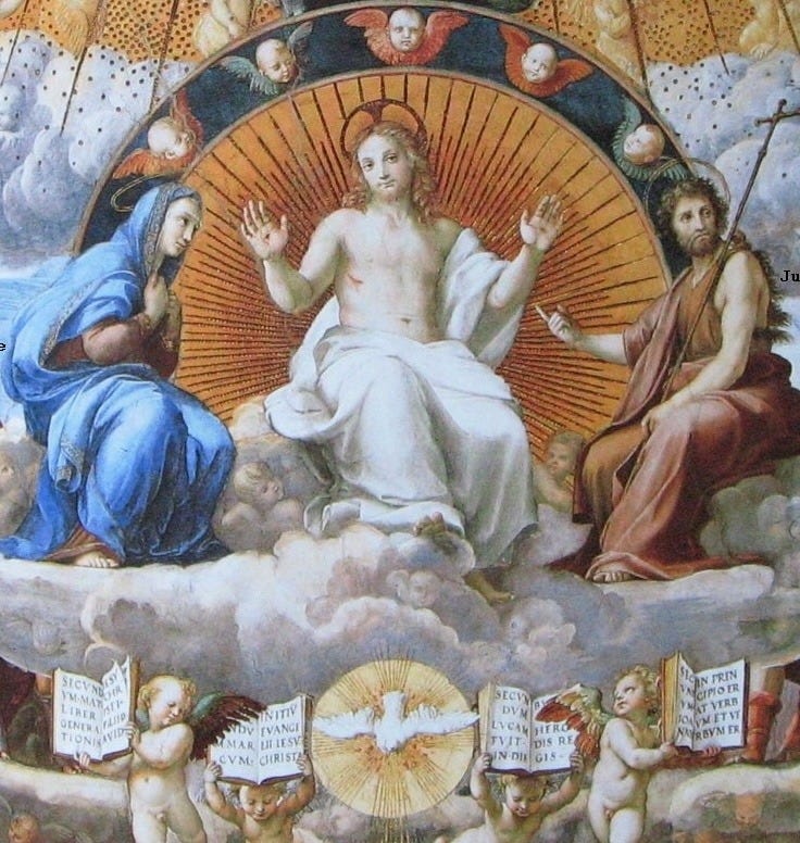 Raphael: Mary and John seated with Christ in his heavenly kingdom, to his right and to his left. (I’m not especialy fond of this painting, though I rather like its John.)